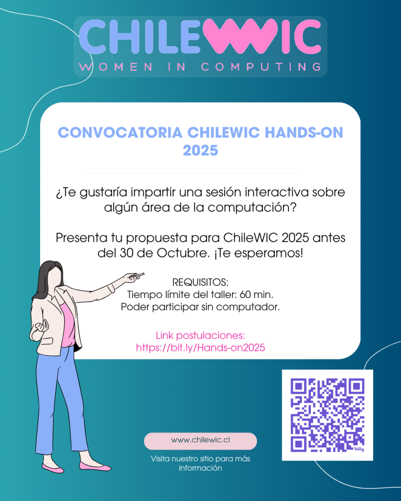 En el marco del XIII Encuentro de Mujeres en Computación 2025, se abre la convocatoria a participar en ChileWIC Hands-on, instancia de talleres prácticos e interactivos, que se llevarán a cabo en sesiones paralelas durante el evento, el día 28 de noviembre de 2025.