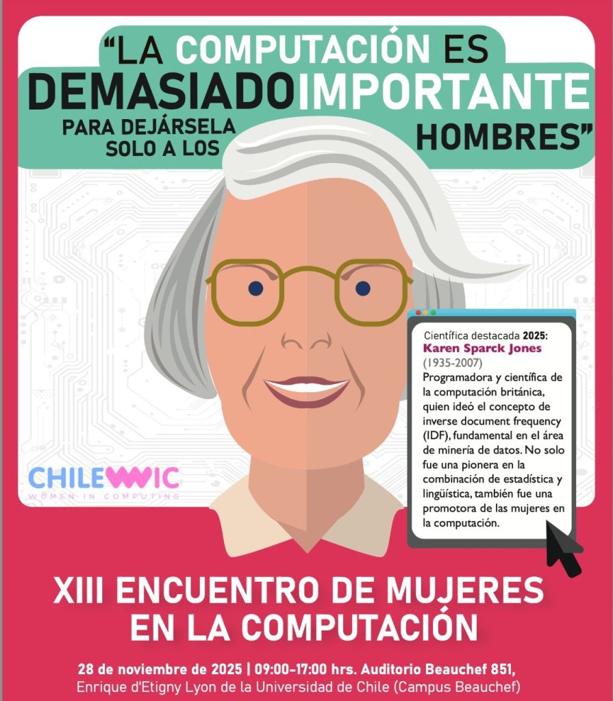 Con la inspiración de Karen Sparck Jones, la destacada programadora y científica de la computación británica, se realizará el XIII Encuentro de Mujeres en la Computación Chile WiC 2025, el viernes 28 de noviembre de 2025 en el auditorio Enrique d’Etigny de la Universidad de Chile.